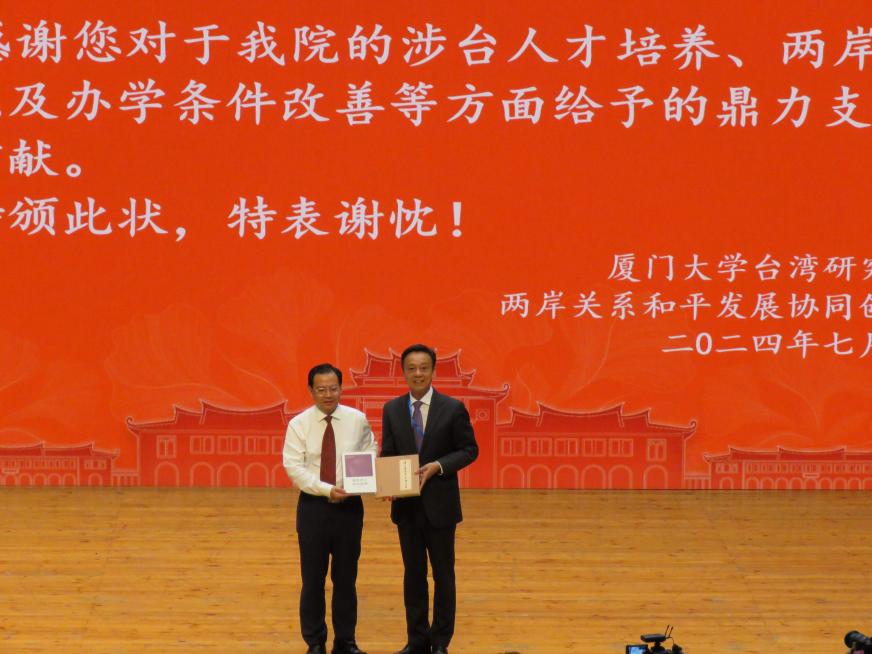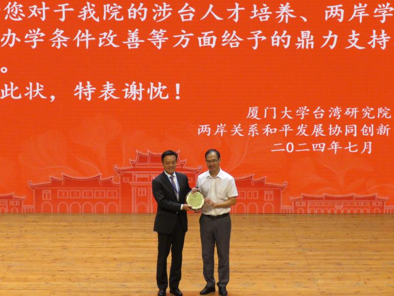 为感谢姚志胜会长长期以来对台湾研究院涉台人才培养、两岸学子交流以及办学条件改善等方面给予的鼎力支持与作出的卓越贡献,台湾研究院党委书记郭锦星代表台湾研究院特地向其颁发感谢状表示感谢,台湾研究院院长李鹏代表接受姚志胜先生回赠谢礼。