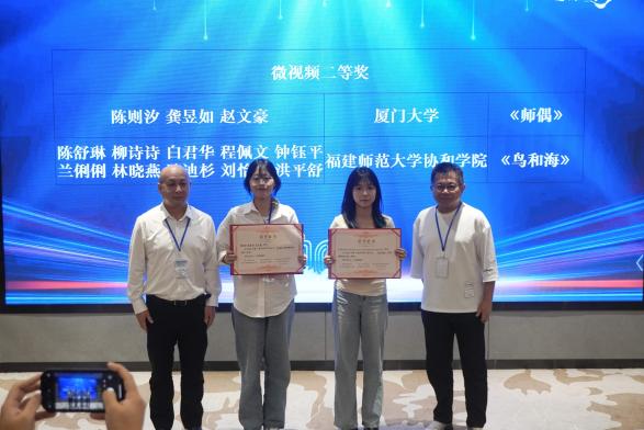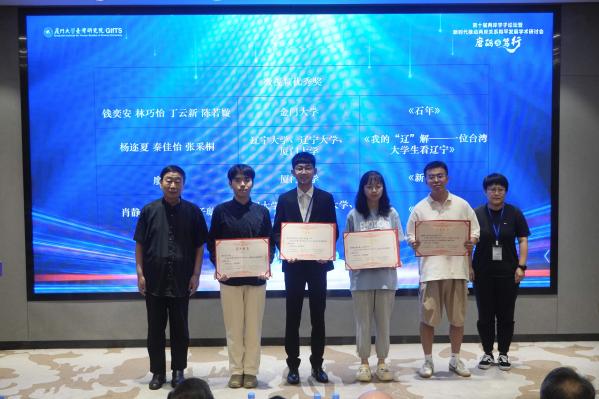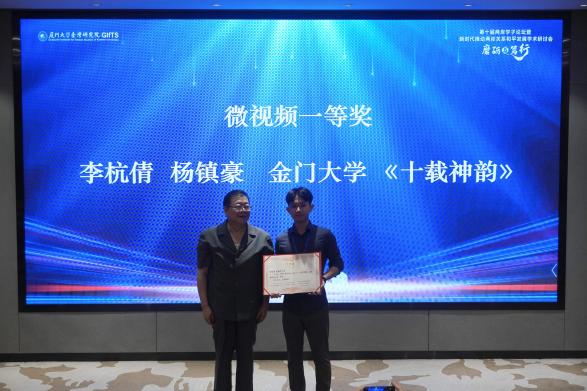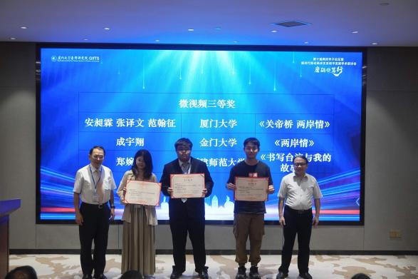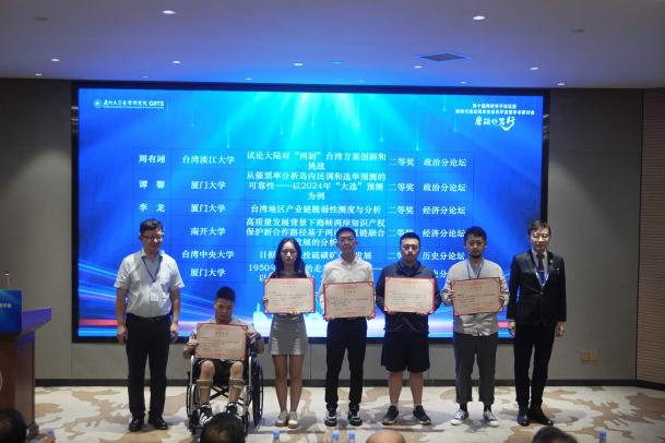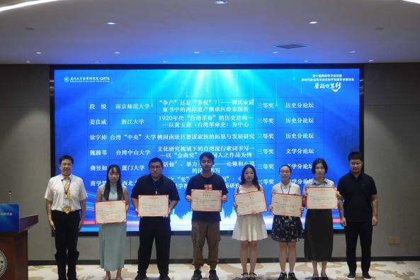 颁奖环节由院党委副书记陈文主持。各分论坛经过层层筛选,评选出了若干优秀论文和微视频作品。政治分论坛中国人民大学博士生于顺的《被“他者”支撑起的自由民主制度 ——台湾民众大陆认知对台湾民主满意度的影响分析》、经济分论坛台湾义守大学博士生撰写的《台湾半导体产业信息透明度与信任程度关系之探讨》、历史分论坛中国社会科学院大学博士生洪思音撰写的《1920年台湾地方制度改革与内地延长主义的真意》、文学分论坛厦门大学博士生陈若凡撰写的《<文学杂志>与1950年代的台湾文学生产》、法律分论坛厦门大学硕士生林彦涛撰写的《台湾地区“防空识别区”:内涵、逻辑与制度》、两岸关系与社会分论坛福建师范大学博士生杨文军撰写的《互动仪式链视角下铸牢台湾青年共同体意识研究》以及由来自金门大学的李杭倩和杨镇豪共同创作并提交至微视频分论坛的《十载神韵》,获得了本届“两岸学子论坛”各分论坛一等奖殊荣。