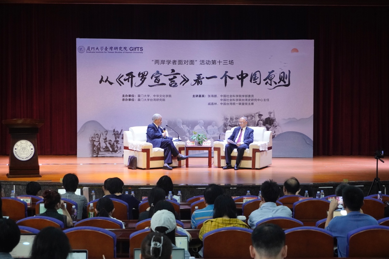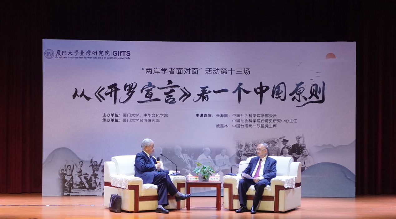2024年5月25日,第十三场“两岸学者面对面”活动在厦门大学法学院模拟法庭举办,本场活动由厦门大学和中华文化学院共同主办,两岸关系和平发展协同创新中心和厦门大学台湾研究院承办。活动邀请中国社会科学院学部委员、中国社会科学院近代史研究所研究员张海鹏、台湾统一联盟党主席戚嘉林,以“从《开罗宣言》看一个中国原则”为对谈主题,两位学者基于台湾历史和两岸关系的长期研究、观察与思考,面对面深入探讨开罗会议召开的背景,《开罗宣言》内容的拟定和历史意义,对台湾地位的历史影响等面向进行深入的讨论。