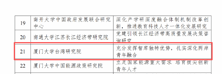 此次入选既是对研究院在台湾研究智库建设方面成就的高度认可,也为进一步提升台湾研究水平提供了重要平台。我院将以本次入选为契机,持续强化智库功能,打造高水平国家级台湾研究智库;着力培育台湾研究智库领军人才,建设高水平研究团队;完善运行机制,深化台湾研究领域理论创新与政策研究,为服务福建发展和国家战略提供强有力的智力支撑和决策服务。