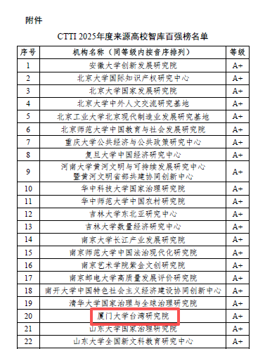 会上,南京大学中国智库研究与评价中心公布CTTI 2025年度来源高校智库百强榜和CTTI 2025年度智库建设最佳案例名单。我院成功入选“CTTI 2025年度来源高校智库百强榜”,等级“A+”;我院提交案例“充分发挥智库独特优势,扎实深化两岸青年融合”入选CTTI 2025年度智库建设最佳案例,等级为“标杆案例”。