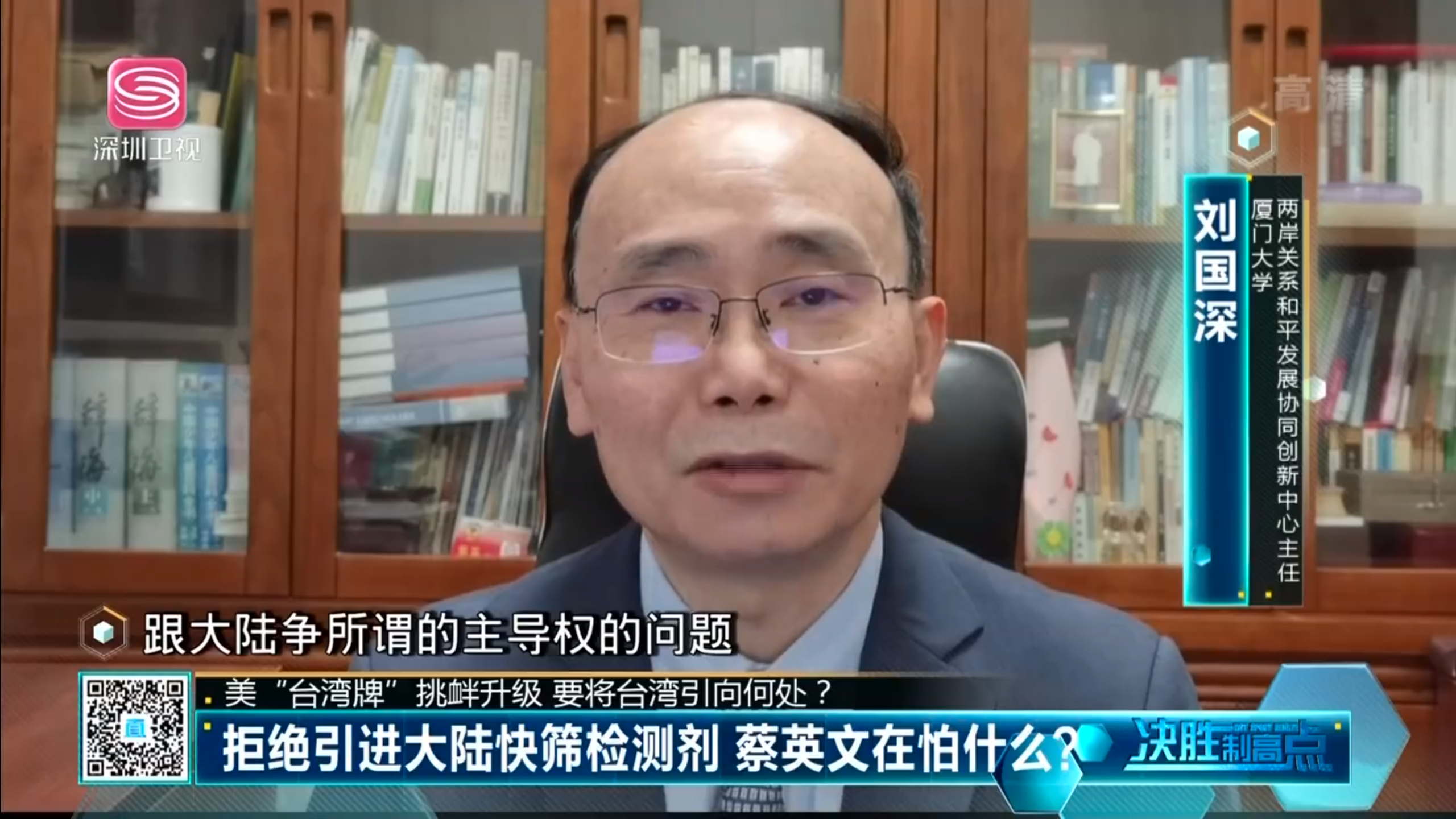 两岸关系和平发展协同创新中心主任、厦门大学台湾研究院特聘教授刘国深近日与北京、上海及台北学者,针对美国大打“台湾牌”等相关话题,共同接受深圳卫视《决胜制高 点》节目连线专访。
