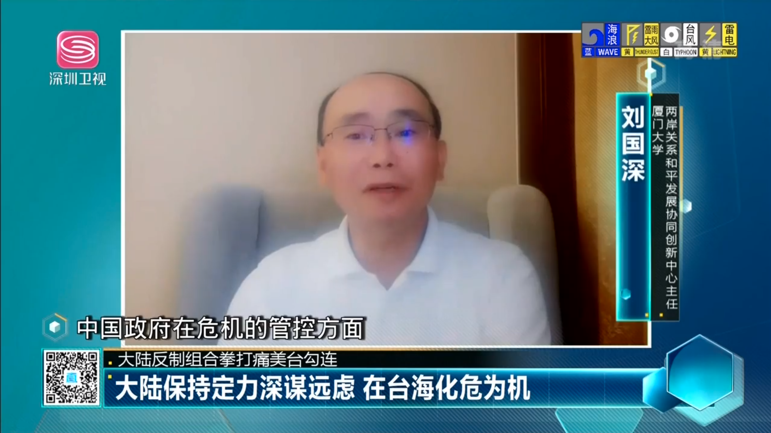 两岸关系和平发展协同创新中心主任、厦门大学台湾研究院特聘教授刘国深近日与上海及台北学者,针对佩洛西窜访台湾(地区)等相关话题,共同接受深圳卫视《决胜制高点》节目连线专访。