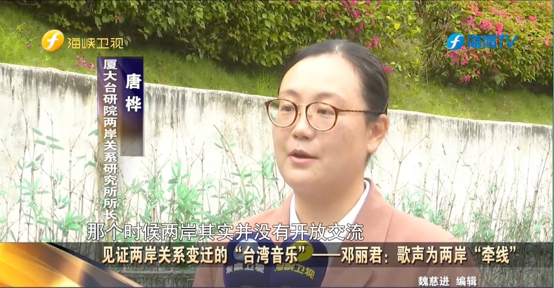 近一段时间,湖南卫视的节目《声生不息·宝岛季》引发了两岸民众的热议,这档节目,带我们走进台湾音乐的世界,体会两岸同胞的亲情和友谊。事实上,音乐既是桥梁,也是纽带,除了让两岸同胞的联系更加紧密,也见证了两岸关系的变迁。厦门大学台湾研究院两岸关系研究所所长、两岸关系和平发展协同创新中心研究员唐桦副教授就音乐交流视角看两岸关系变迁的话题接受海峡卫视的采访。