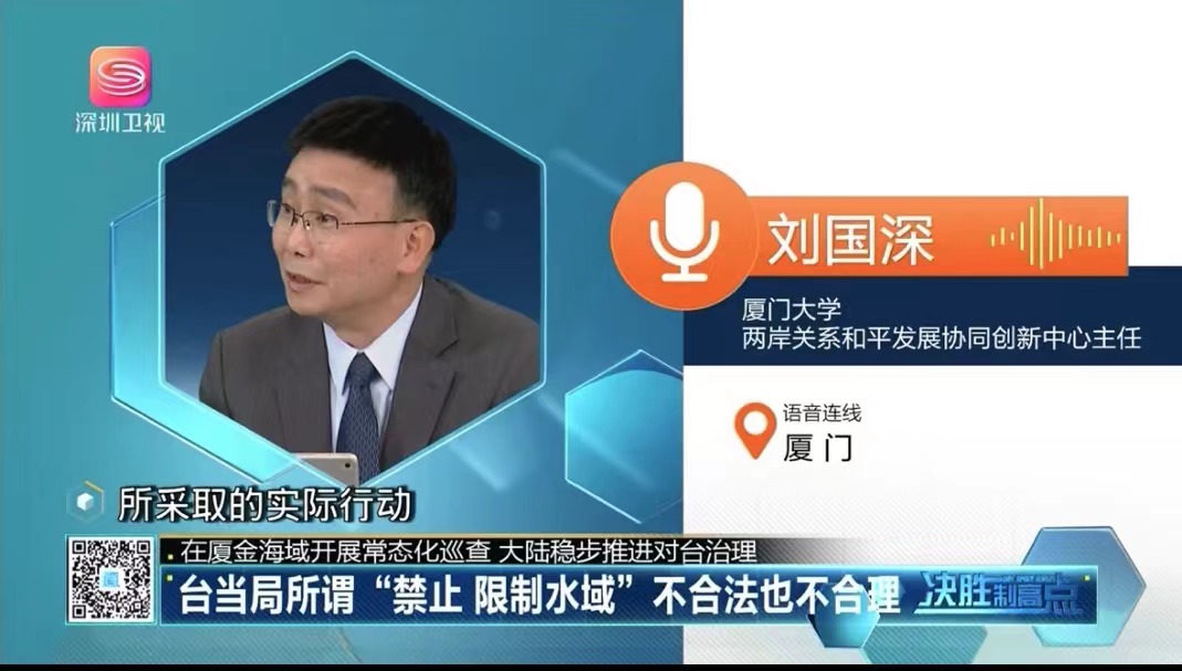 近日,两岸关系和平发展协同创新中心主任、厦门大学台湾研究院特聘教授刘国深接受深圳卫视《决胜制高点》栏目的连线采访,剖析“‘金门翻船事件’后大陆海警在厦金海域进行常态化巡查”等相关议题,并结合近期召开的中央对台工作会议的重点内容发表观点。
