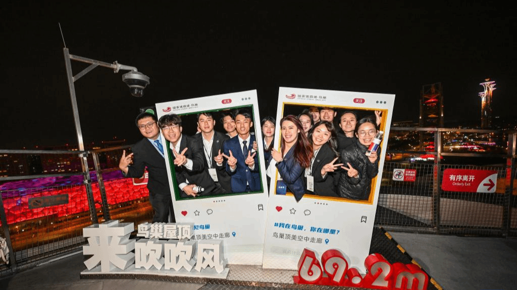 (Members of a Taiwan youth delegation pose for photos in the air corridor of the National Stadium in Beijing, China, April 8, 2024. /Xinhua)